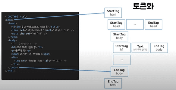 위 사진처럼 html 마크업 시 우리가 열고 닫는 태그들이 어떤 구조로 열고 닫히는지를 설명하는 토큰들로 변환된다.