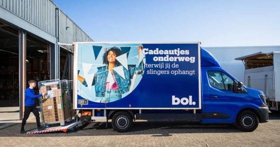 Hier is een foto van een bezorgwagen van Bol.com (een bekende online winkel in Nederland) die ik online heb gevonden — niet door mij genomen. Het is geen grote vrachtwagen, maar hij heeft wel een lift.